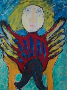 Maleri af Grethe Lauesen 1,40 x 1,00 m; Titel: Jeg har fået vinger. Billedet hænger på min væg og er et billede til daglig glæde.