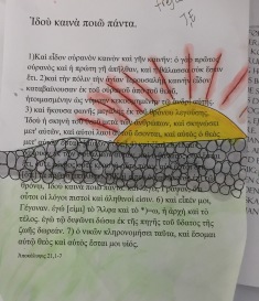 Billedet er malet af en konfirmand over bibelteksten fra Joh. Åb. kap 21, v 1-7