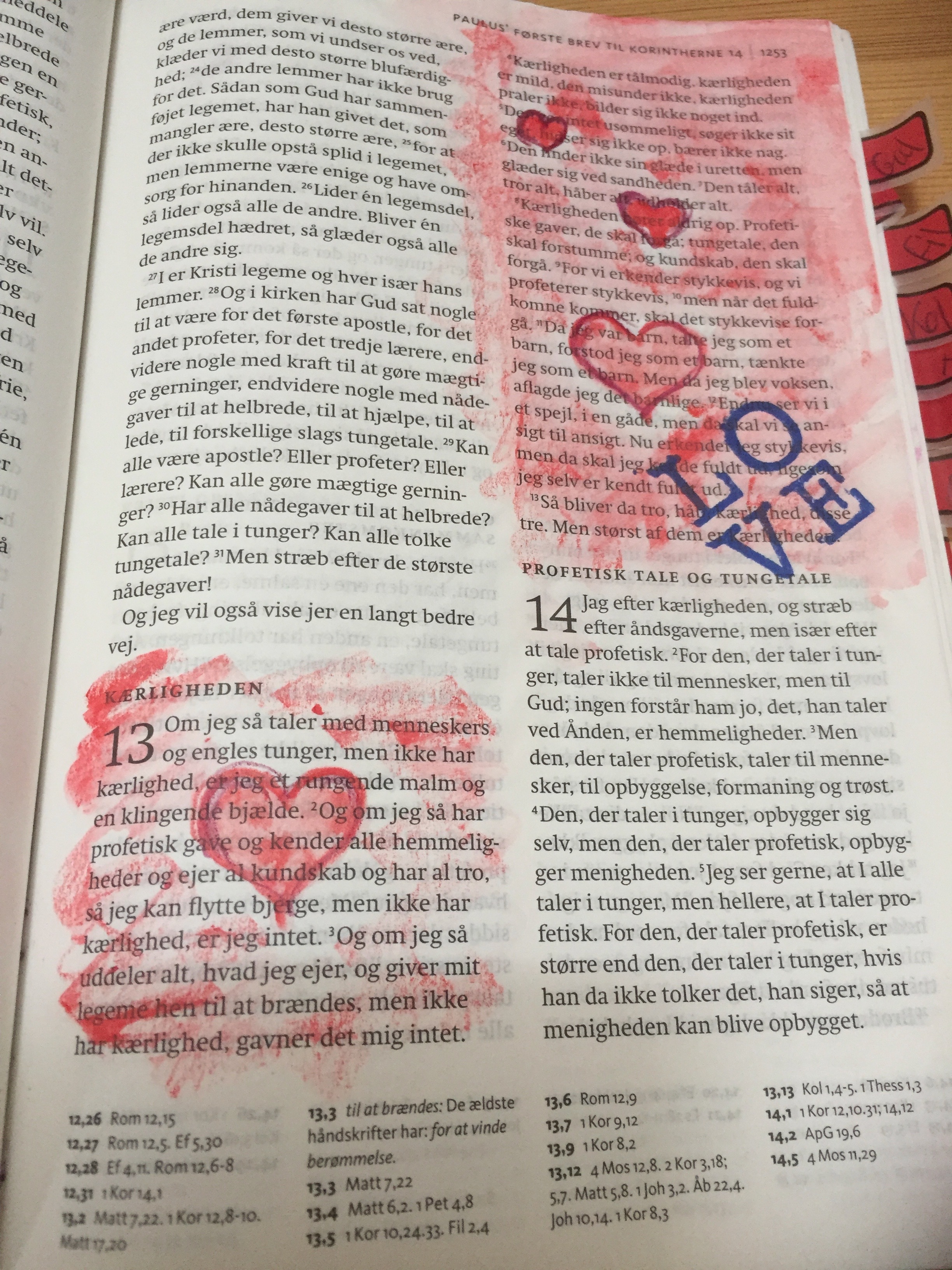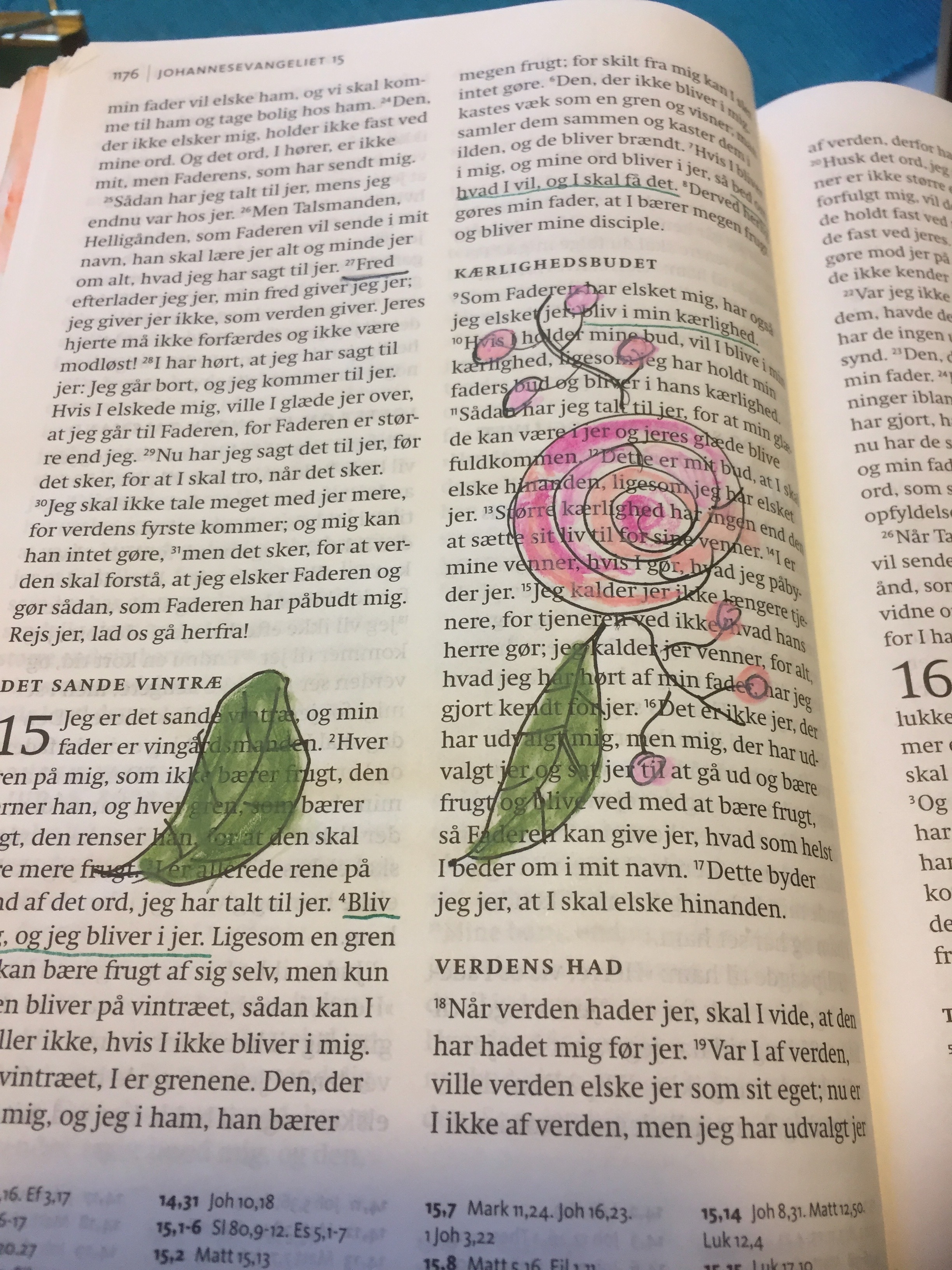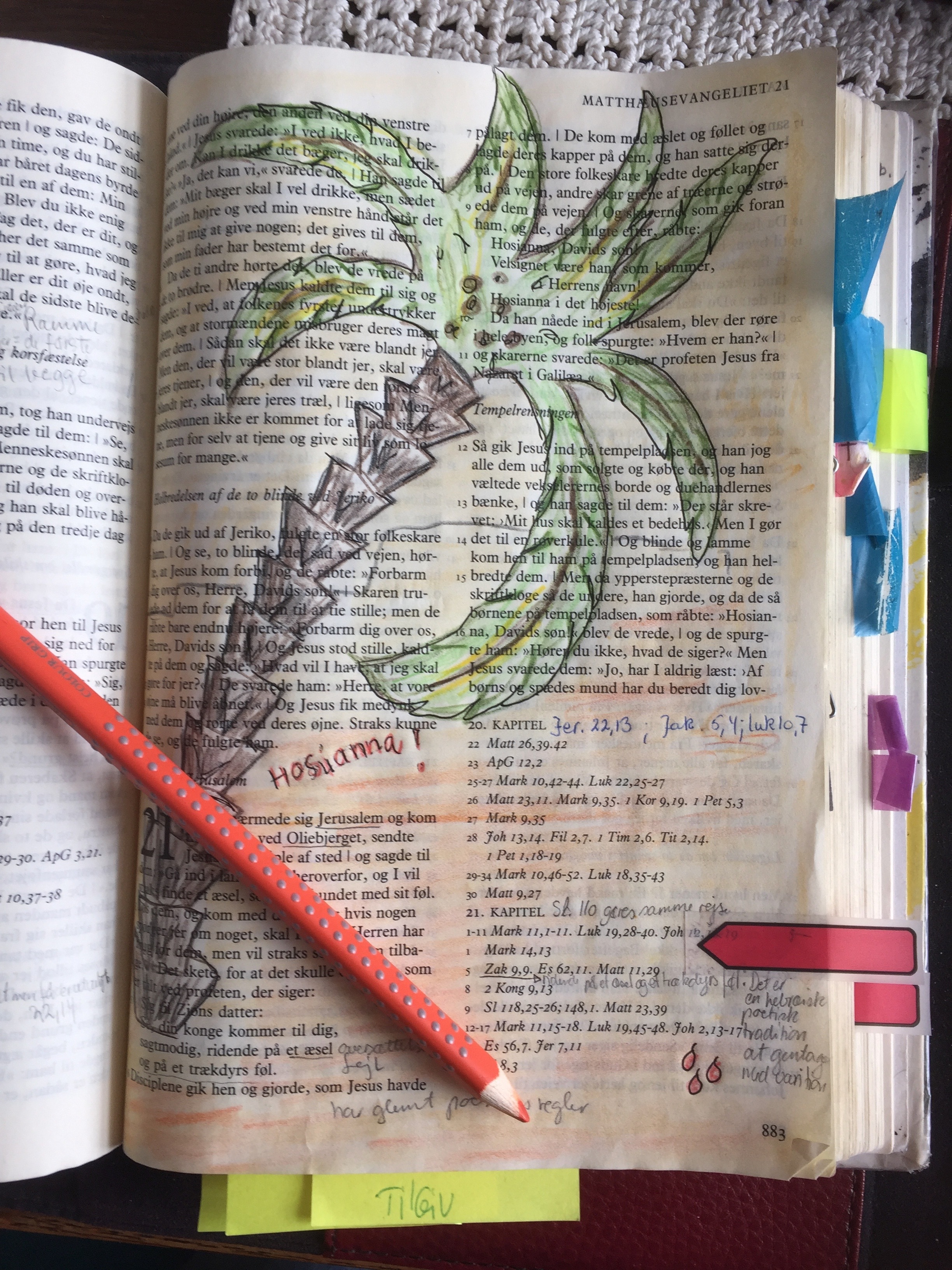 Jeg har altid sagt til mig selv, at jeg ikke kunne tegne. Men nu gør jeg det så altså alligevel. Jeg maler/tegner i min Bibel. Det kan du også gøre. Lad dig inspirere af billederne her på siden. Køb evt. en æske akvarelblyanter, som dem jeg bruger. Bare gør det, kast dig ud i det og "læs" bibeltekst således.