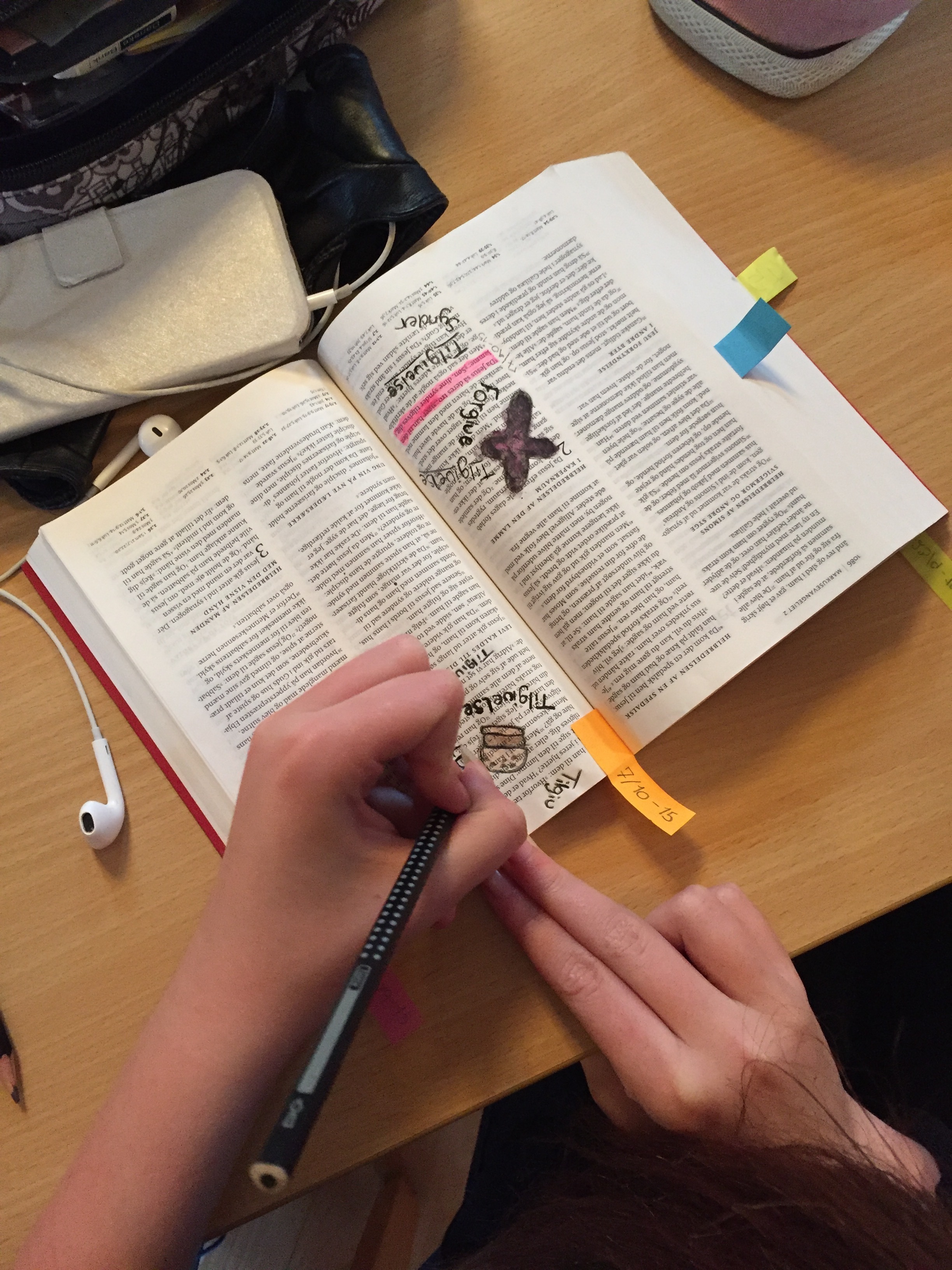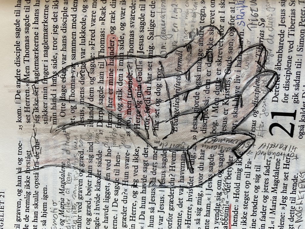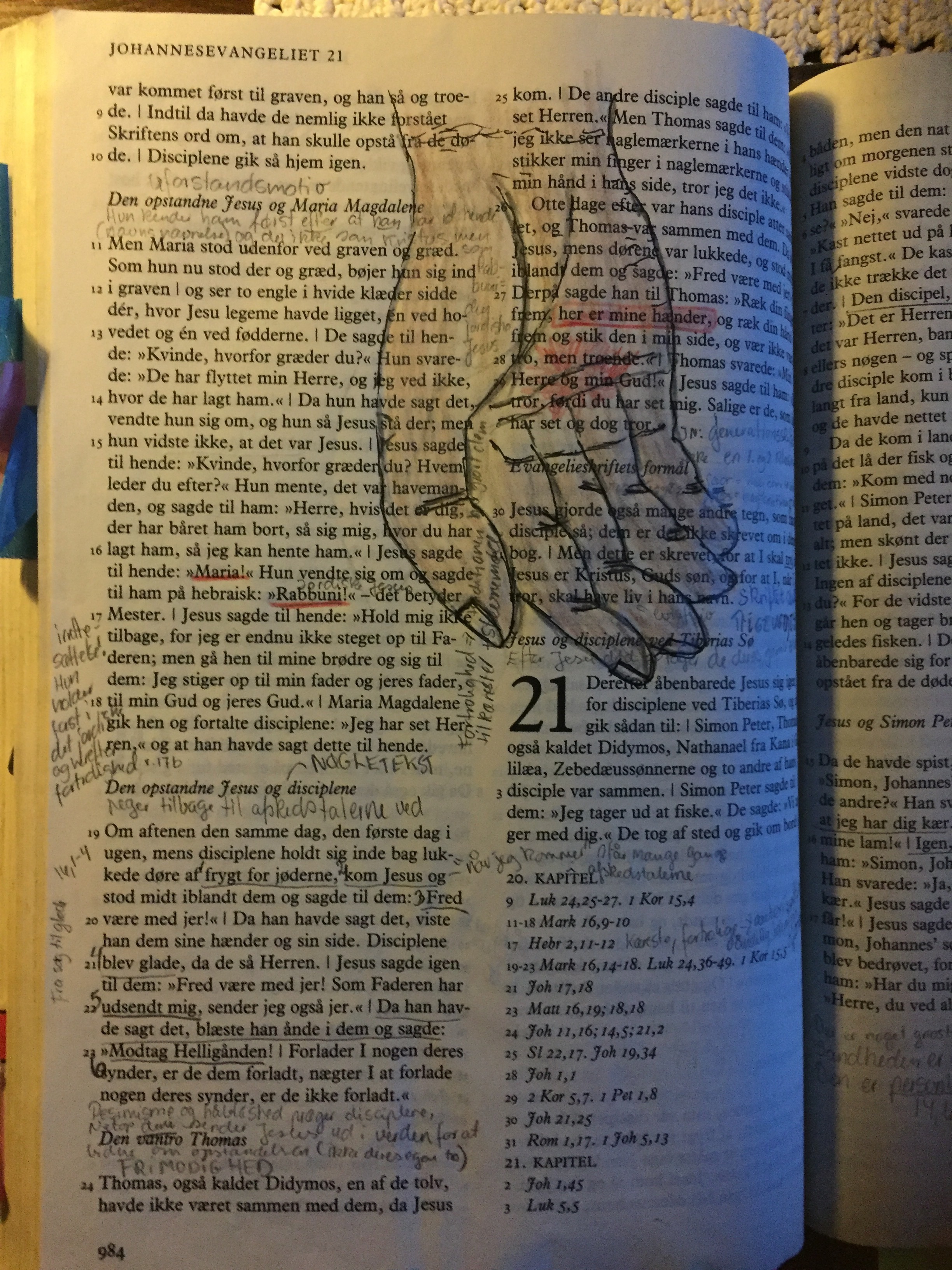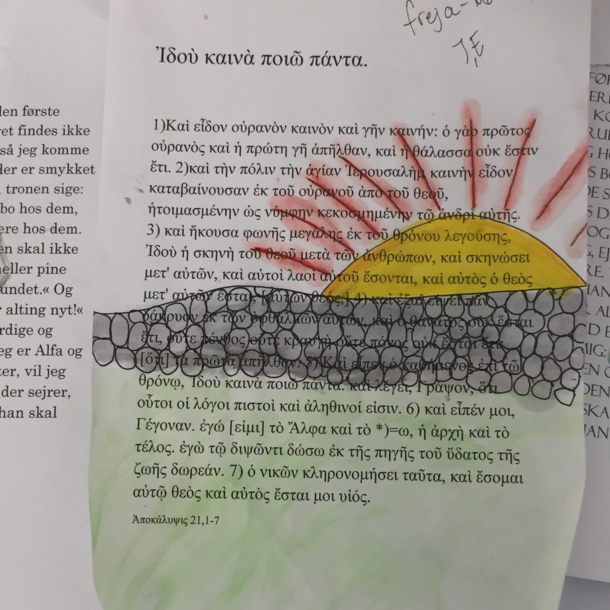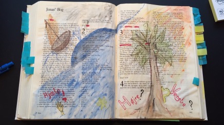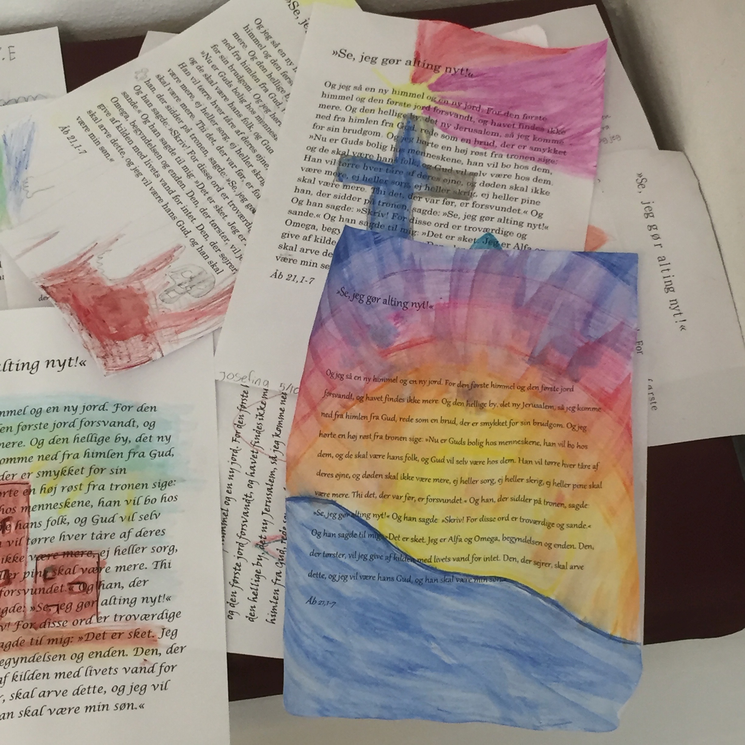 Jeg har brugt bibelmaleri i mange år i mit arbejde med både konfirmander og i sjælesorgssammenhæng. Nedenfor ses nogle eksempler fra konfirmandernes bibler.