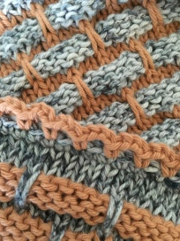 3rk (B) 4r, 1 m løst af med garnet bag (gb) arbejdet (p gennem m som om man ville strikke en retmaske), *5 r, 1la gb*, fortsæt p ud og slut med 4 r