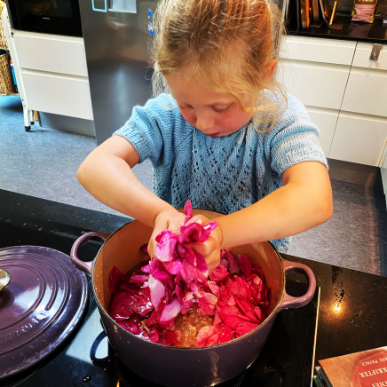 Her er vi igang med at lave rosensirup af hybenrosenblade. Jeg ville ønske, at I havde kunnet få duften i køkkenet med, den var himmelsk! Det er sommer på glas til mørketiden.
