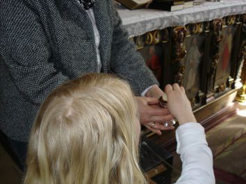 [24] En kikkasse er egentlig et stort patentglas med et detaljeret lille sceneri inden i og tekst skrevet med tusch udenpå. En julekrybbe f.eks. Eller til påske den gode hyrde med lammet. Glasset kommer med glæde på familiens frokostbord derhjemme i højtiden ved vi. Fadervor-kransen er et armbånd af spændende perler, der hver symboliserer bønnens forskellige led. Det er en måde at indlære på, gennem fingrene. Det anvender de udover i andagten også derhjemme. Det er nemlig en hjælp til forældrene til at overvinde blufærdigheden og komme i gang med at bede aftenbøn med deres barn når de kan have kransen imellem sig og med vores opfordring til at lære den udenad. Sammen!